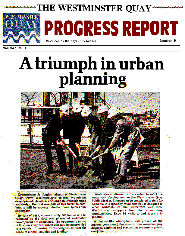 Westminster Quay A 45 acre urban waterfront revitalization development in New Westminster, B.C. incorporating over 1330 residential units, a 70,000 sq. ft. festival market, a 125 room hotel, office buildings and a 1.5 km waterfront promenade. |